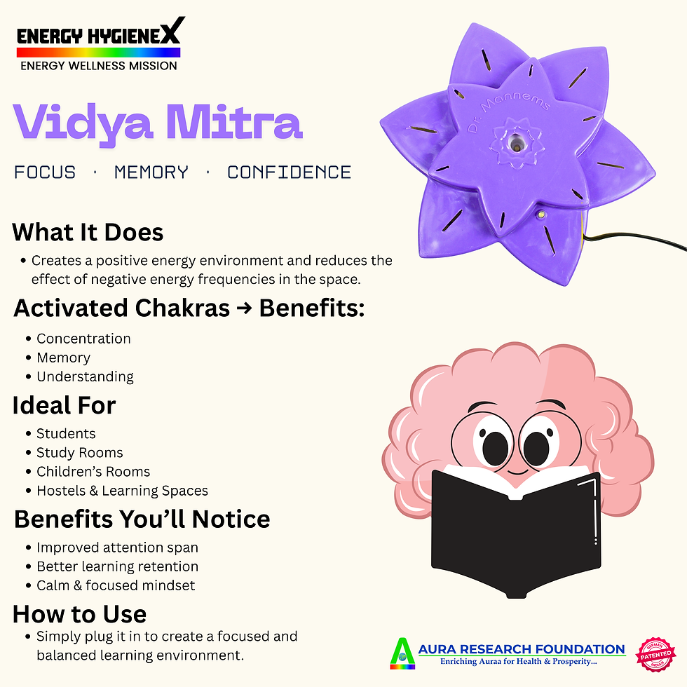 It is an electronic device which creates a positive energy environment in living area. It subsides the effect of negative energy frequencies in our living area. It is useful to activates the upper Chakras which induces Concentration, Memory, Intuition and Understanding. It can be useful for students / children room, Study room, Hostels etc. for Mental Stability, Concentration, Memory and Confidence.